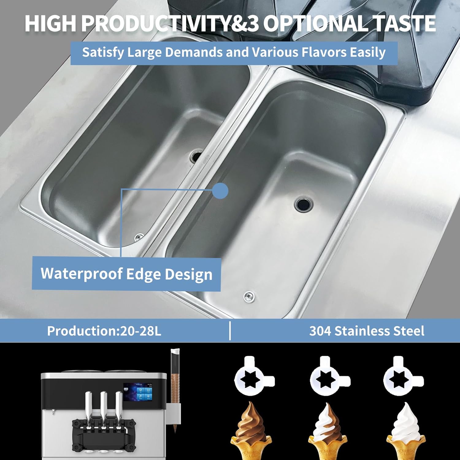 2200 W 2+1 -makuinen pehmytjäätelökone kaupalliseen käyttöön, nopea jäähdytys ja automaattinen puhdistus.